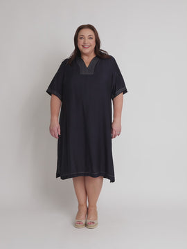 - The relaxed silhouette flows gently over the body, with a flattering knee-length hem and a notched neckline that adds a hint of polish.