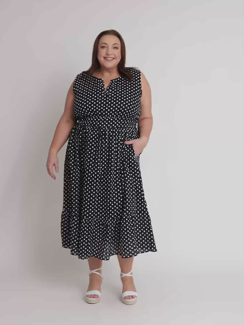 • Featuring a timeless navy base with white polka dots, this sleeveless midi dress has a flattering notch neckline, a gathered elastic waist for shape, and a softly tiered skirt that moves beautifully.