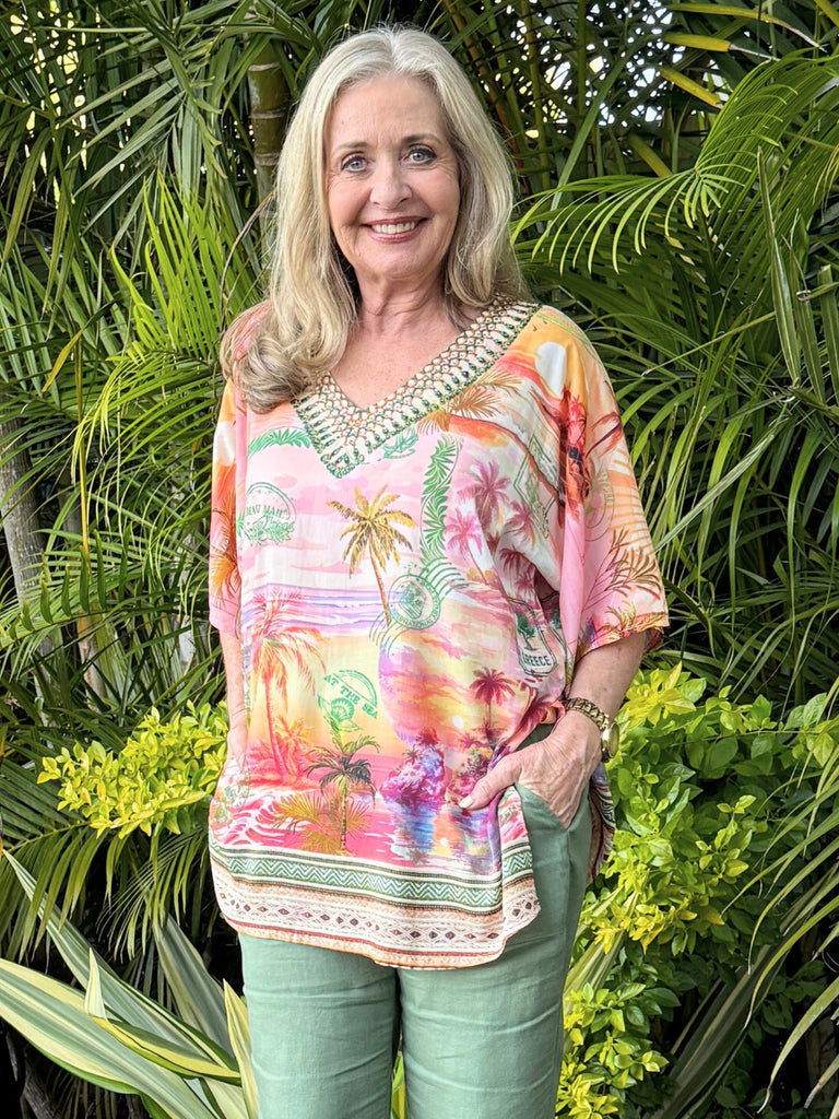 - Make a statement with the Passport Print V-Neck Top, where relaxed style meets tropical escape.
