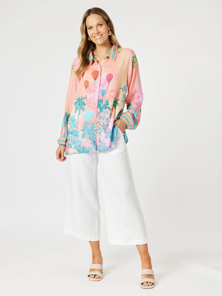 - Add a playful touch to your wardrobe with the Balloon Print Shirt, featuring a vibrant hot air balloon and tropical motif in stunning shades of pink, turquoise, and coral.