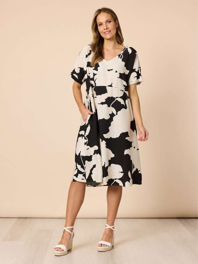 Barcelona V Neck Floral Print Dress - Black/Natural