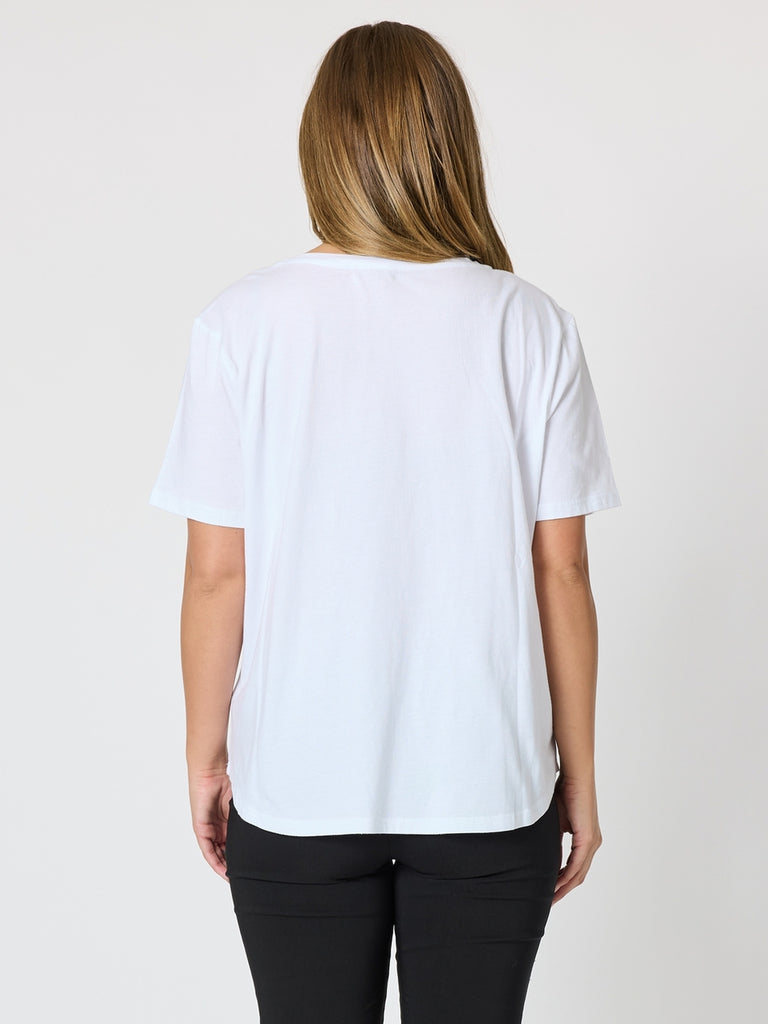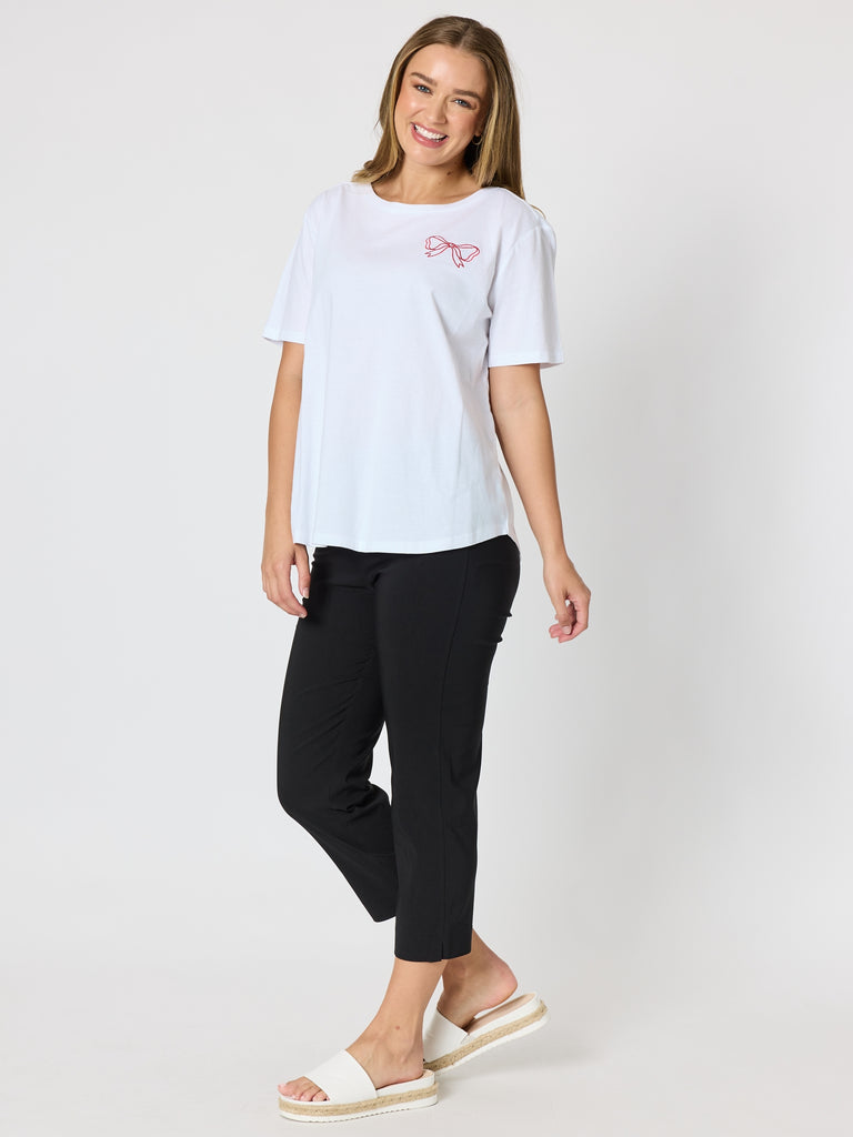 - A fresh take on a classic white tee, the Embroidered Bow Tee features a simple yet chic red bow motif on the chest for a playful touch.