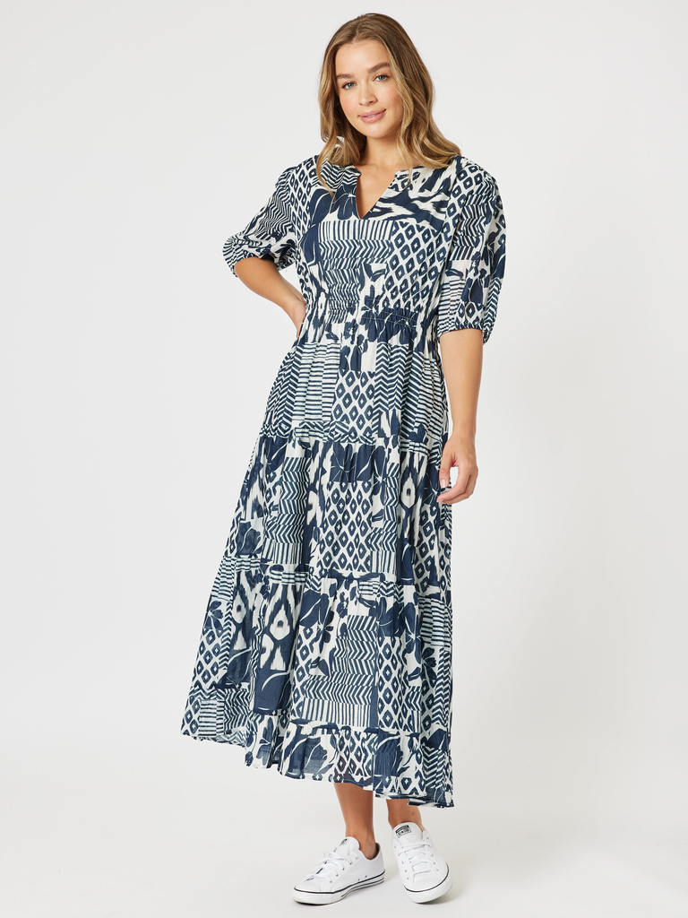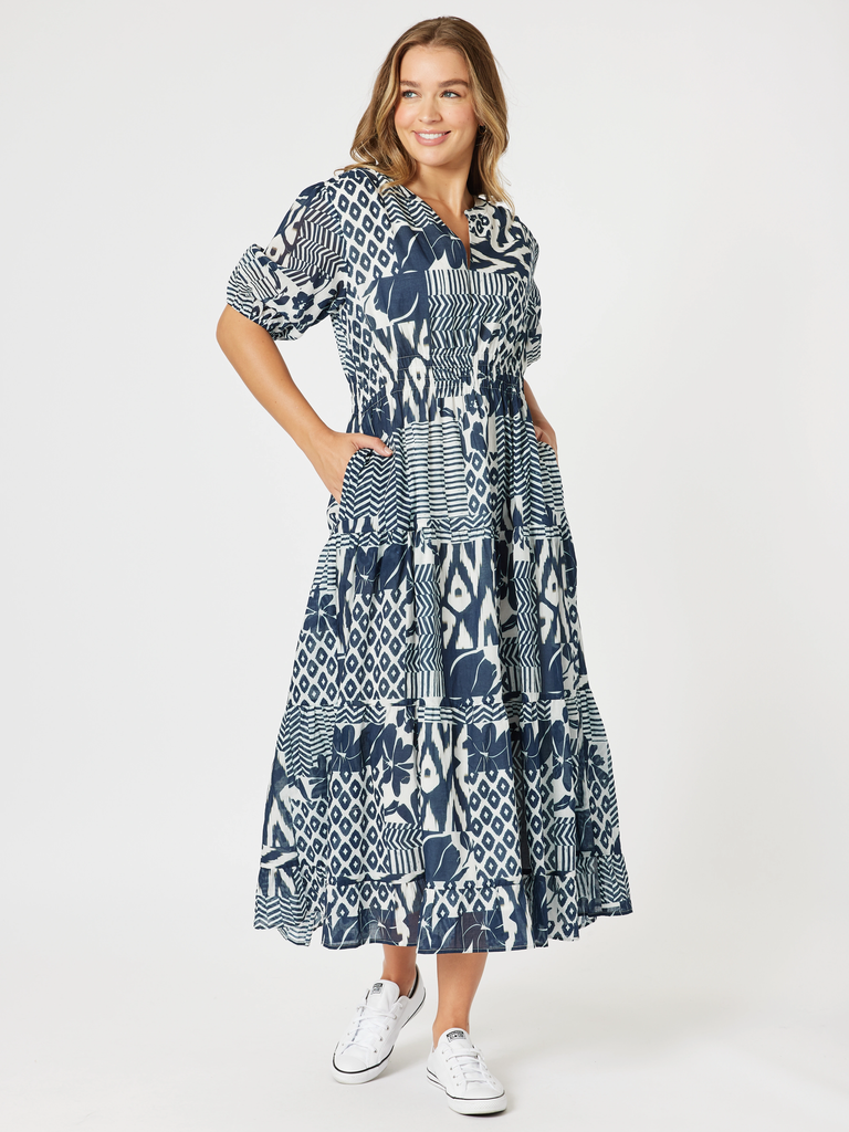 - Make a statement in the Calabasas Print Dress, a show-stopping piece featuring an artful mix of navy and white geometric and floral motifs.
