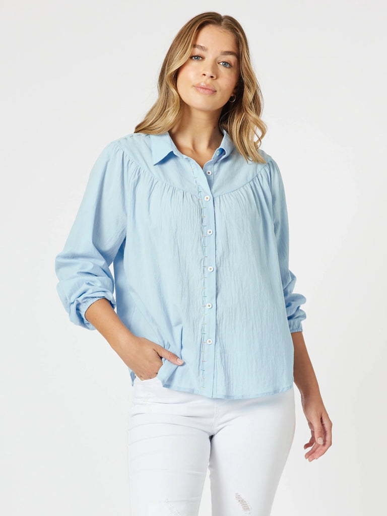 - Subtle gathers at the yoke add a touch of femininity, while the contrast crayon stitching along the placket brings a fun, distinctive detail.