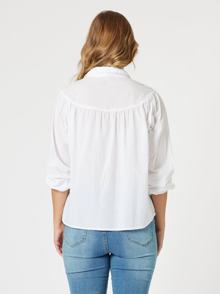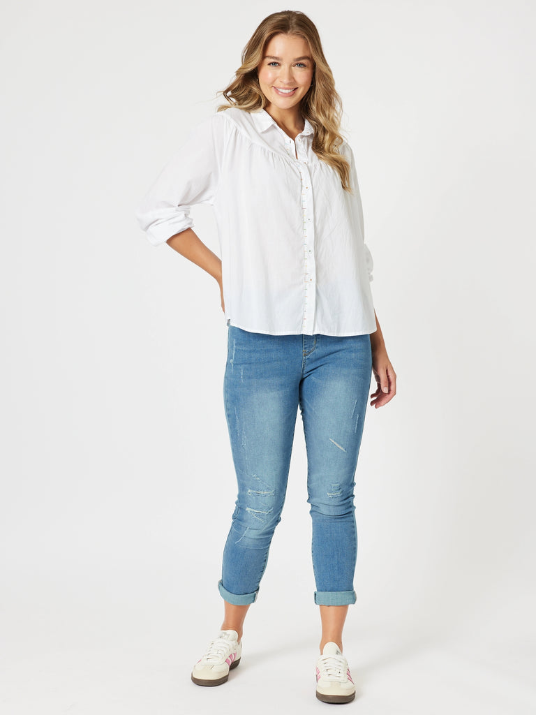 - Subtle gathers at the yoke add a touch of femininity, while the contrast crayon stitching along the placket brings a fun, distinctive detail.