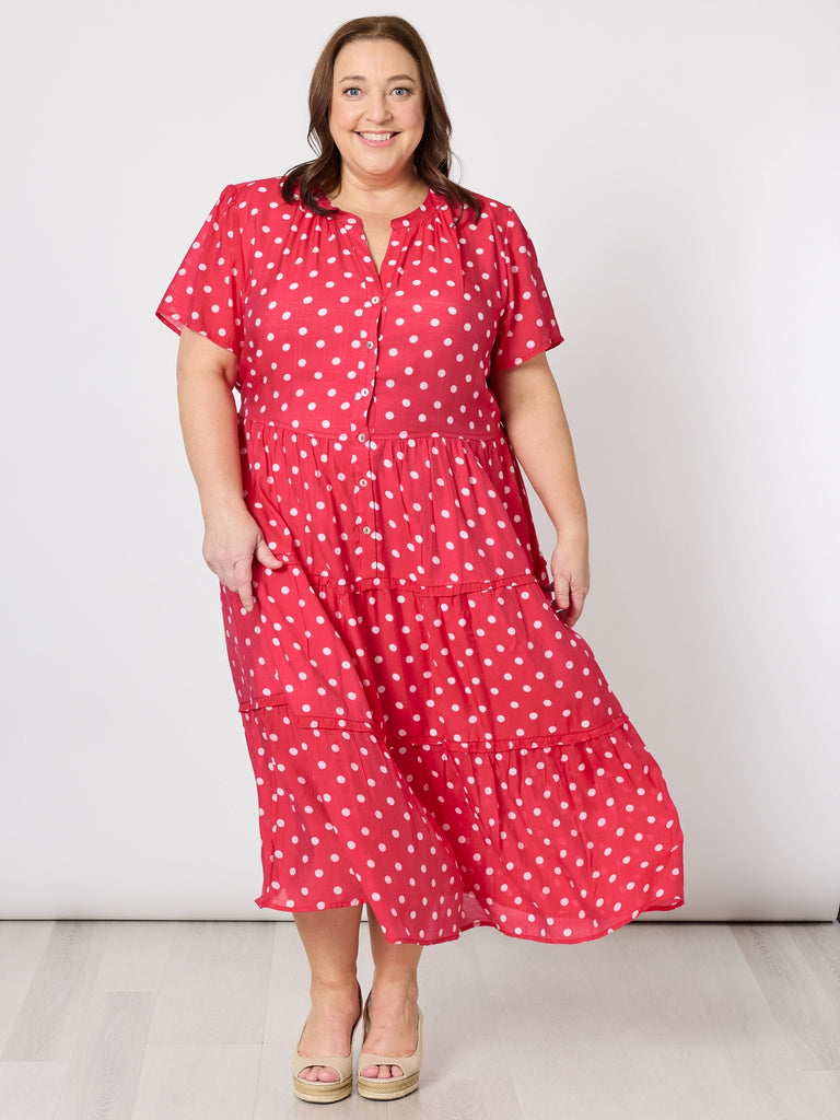 - Showcasing a vibrant red base adorned with crisp white polka dots, this classic Gordon Smith silhouette features a partial button front, short sleeves, and a flowing tiered skirt for effortless movement.