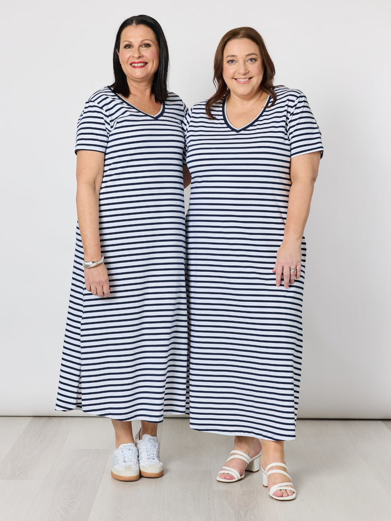 - The Gemma Stripe Print Dress is a timeless wardrobe staple, featuring a classic navy and white stripe design.