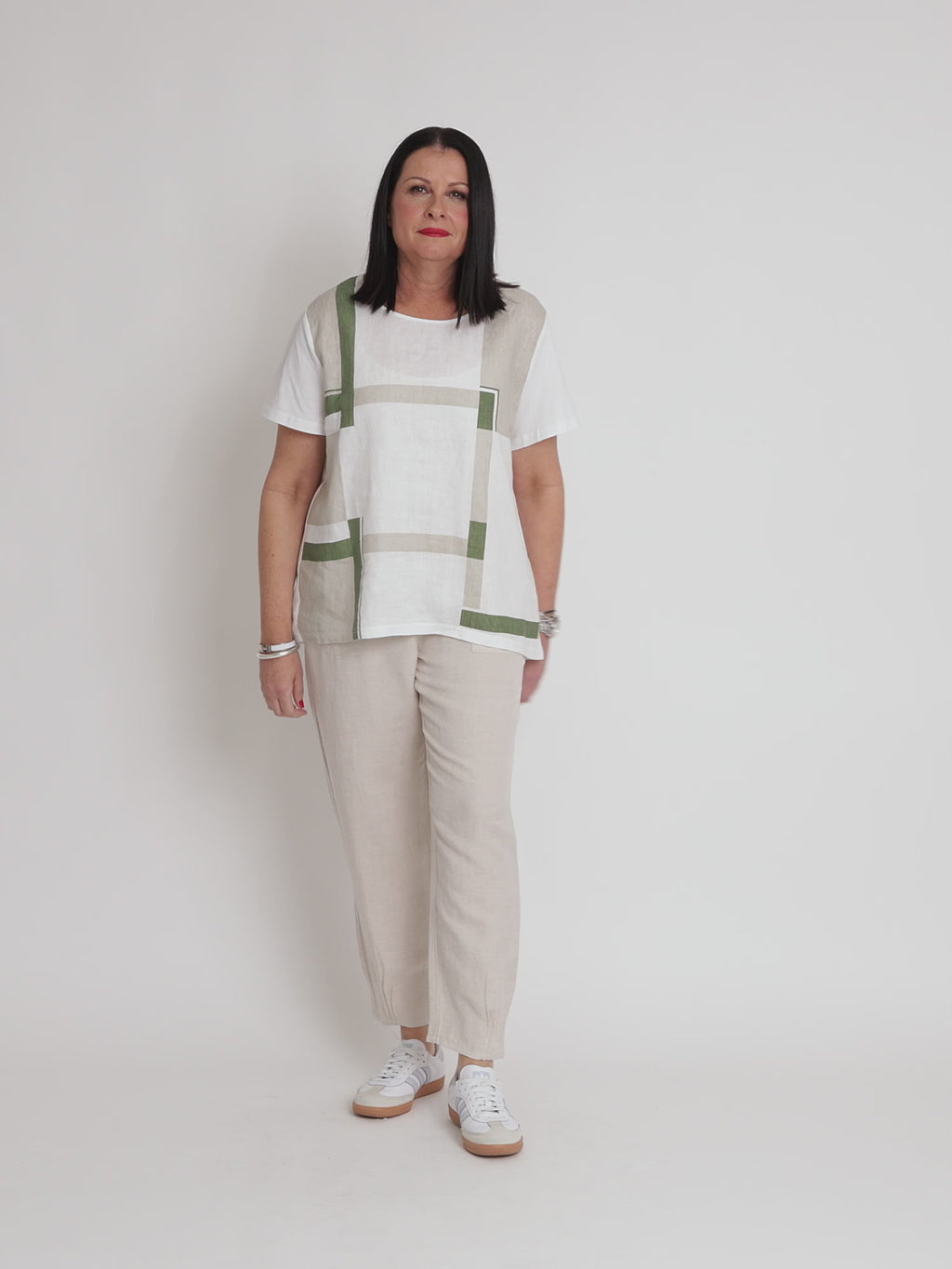 - Featuring an abstract block print in neutral and basil tones, this top blends clean lines with an artistic touch.