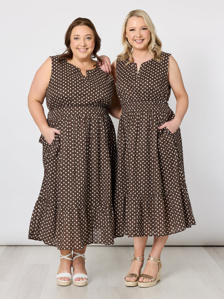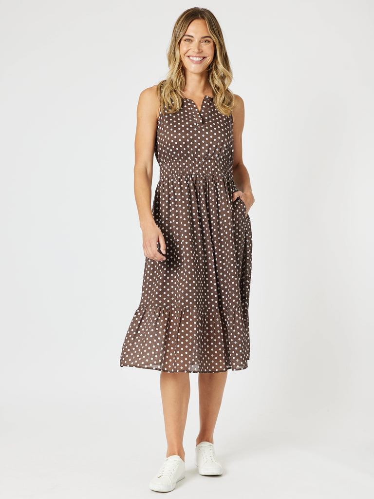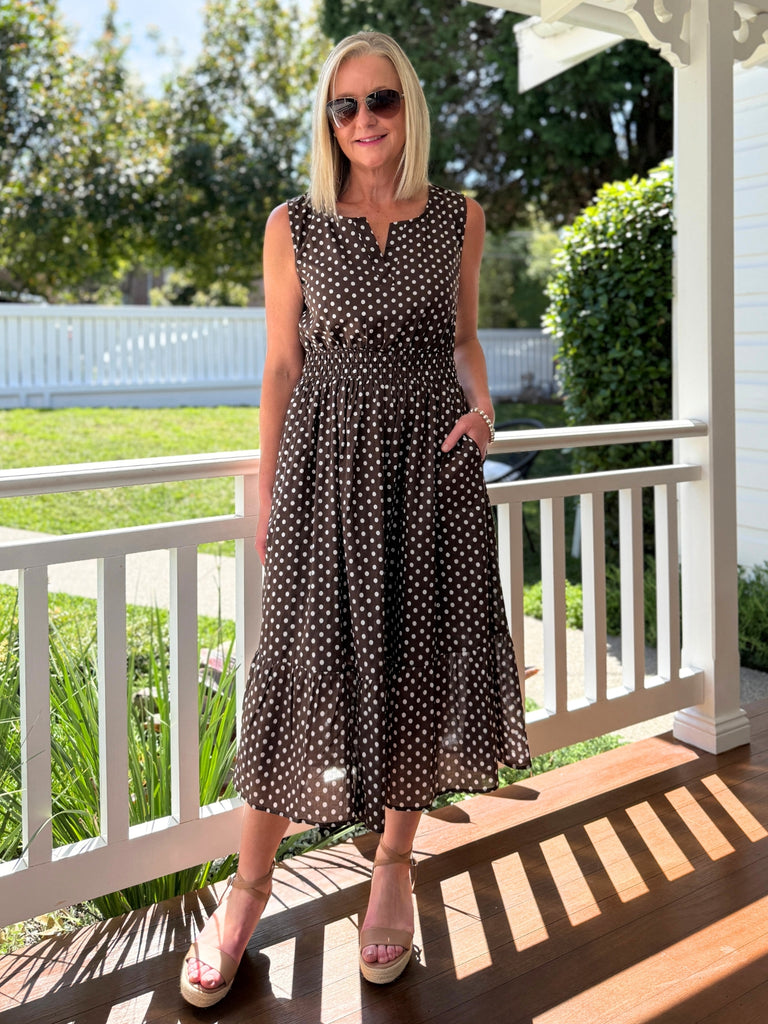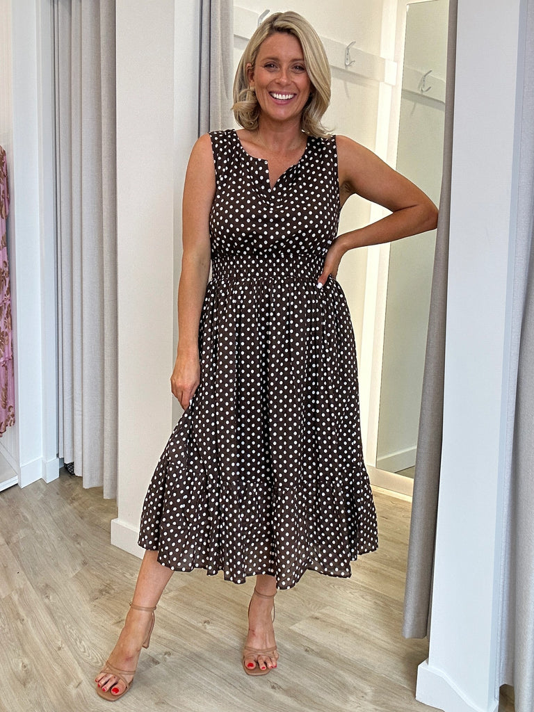 - Featuring a timeless koko base with white polka dots, this sleeveless midi dress has a flattering notch neckline, a gathered elastic waist for shape, and a softly tiered skirt that moves beautifully.