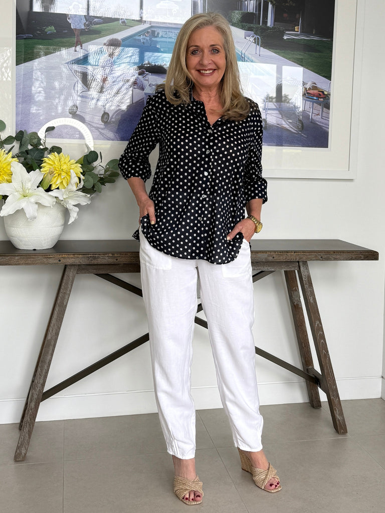 - Featuring a navy base with crisp white polka dots, this lightweight button-up shirt is designed with a flattering collar, 3/4 sleeves, and a relaxed silhouette that works tucked in or worn loose.