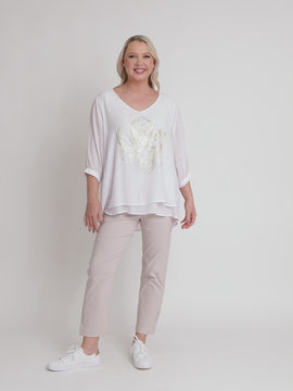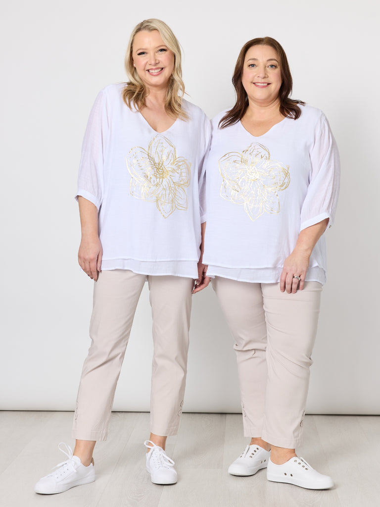 - A beautiful blend of shimmer and simplicity, the Gold Flower Double Layer Top adds an elegant touch to your everyday wardrobe