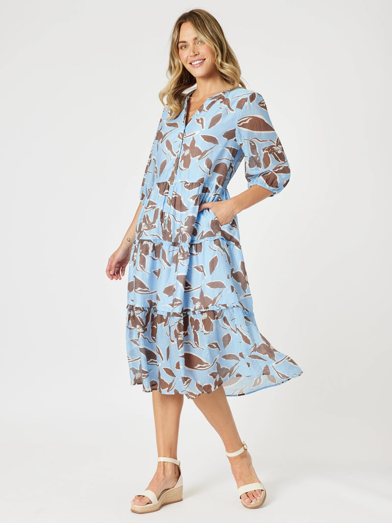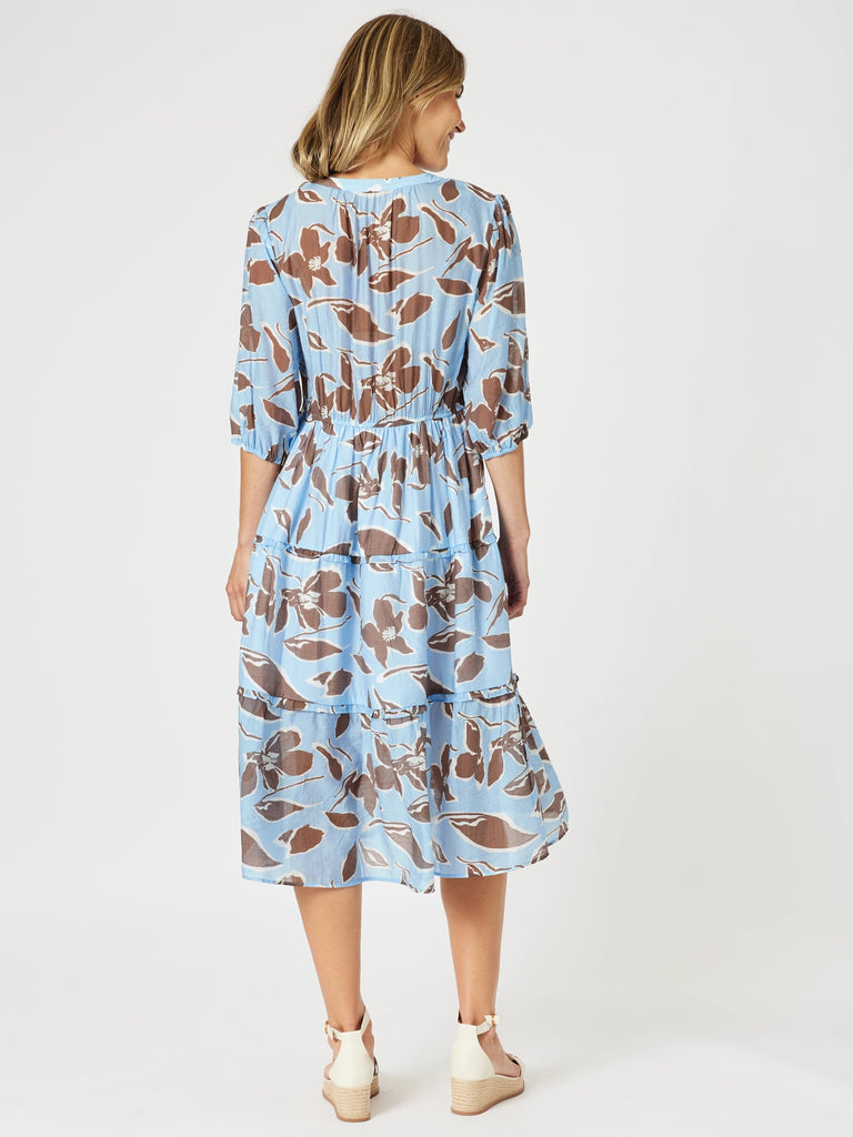 - Featuring a soft sky-blue base with bold brown florals, this midi dress is crafted from lightweight fabric with a breathable cotton lining through the body for all-day ease