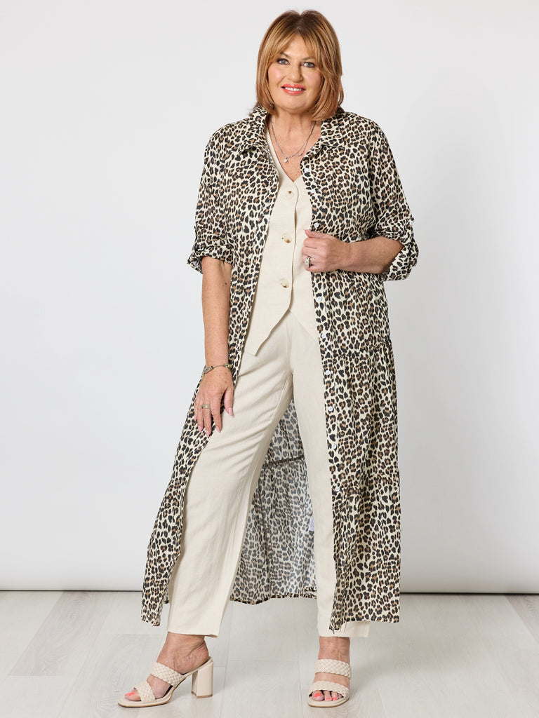 - It features a collared neckline, button-through front, tab up sleeves for multiple sleeve length options and removable rope fabric belt with tassels.