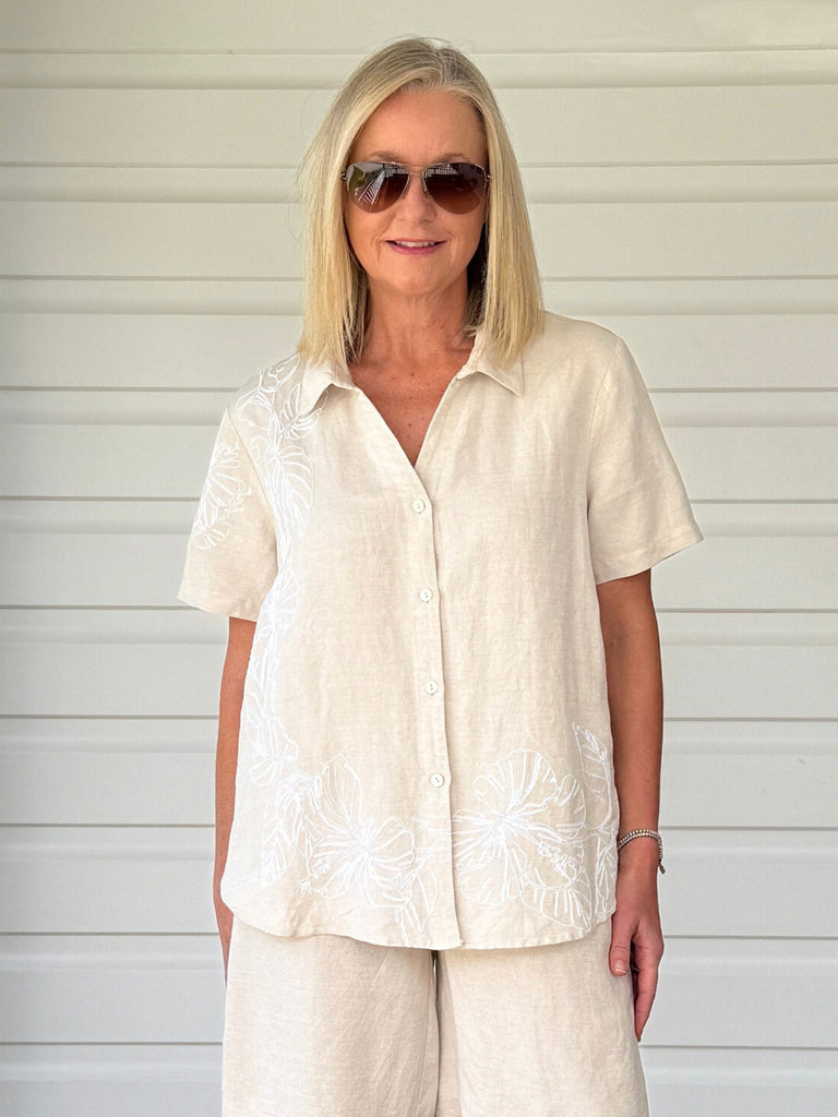 - Crafted from linen blend, this short-sleeve shirt features delicate white floral embroidery along the shoulders and hem, adding a subtle yet elegant touch to its natural-toned base.