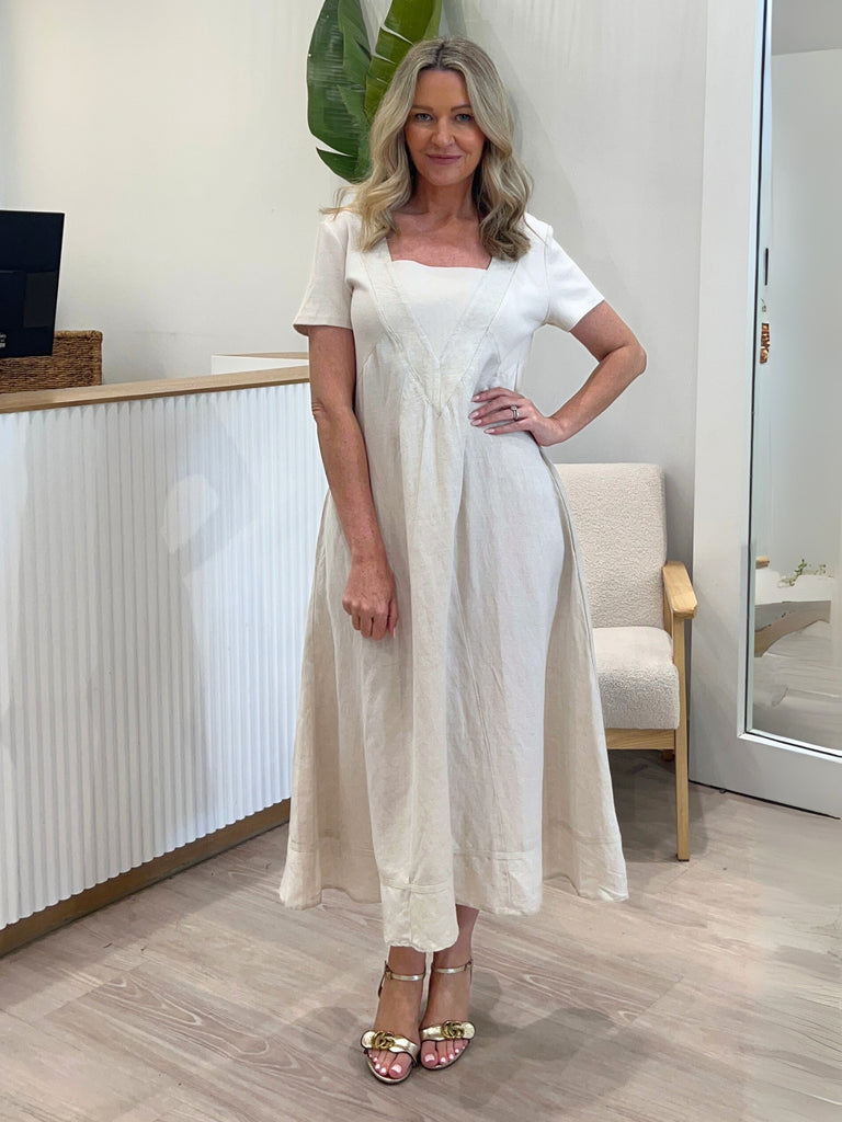 - Crafted from a soft linen-blend, this midi-length dress features a square neckline layered under a wide V-panel, finished with stretch ribbing at the shoulders and back for added comfort and flexibility.