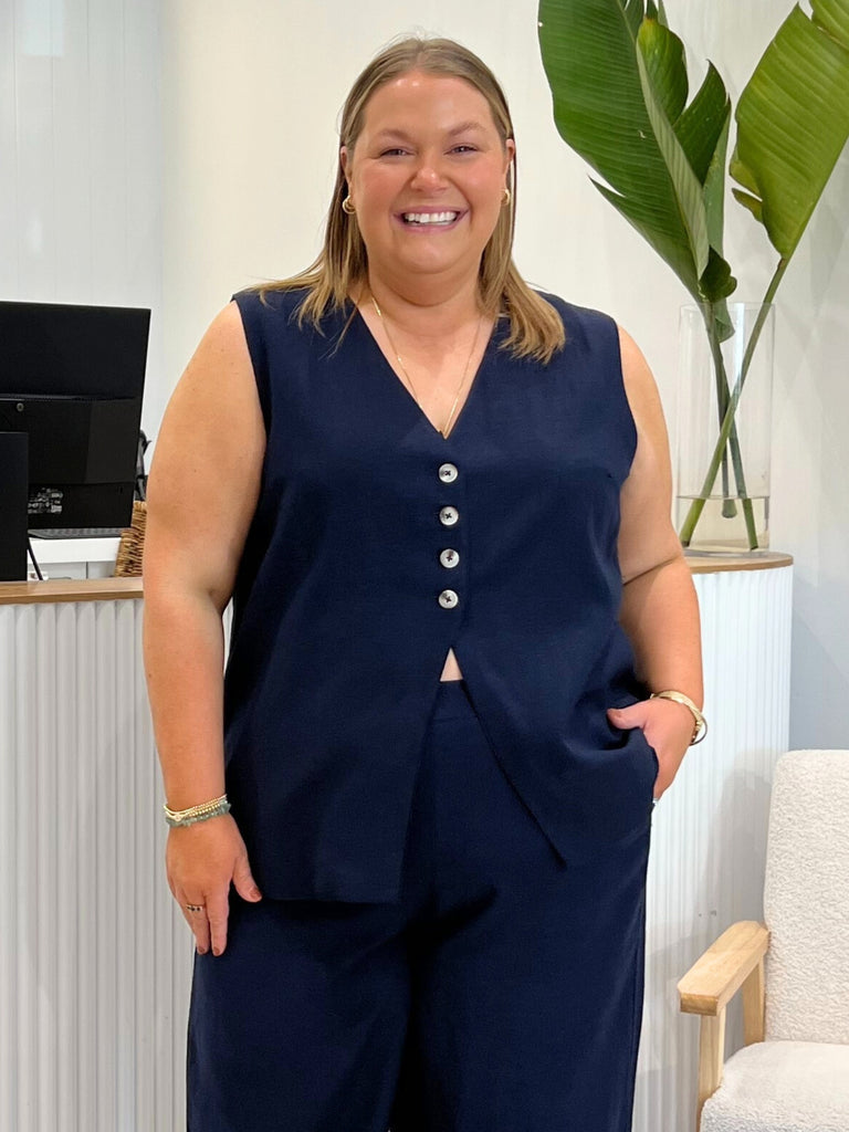 - Crafted from a soft linen-blend fabric, this sleeveless vest features a flattering V-neckline, three front buttons, and a sleek longline silhouette with a front split for ease of movement.