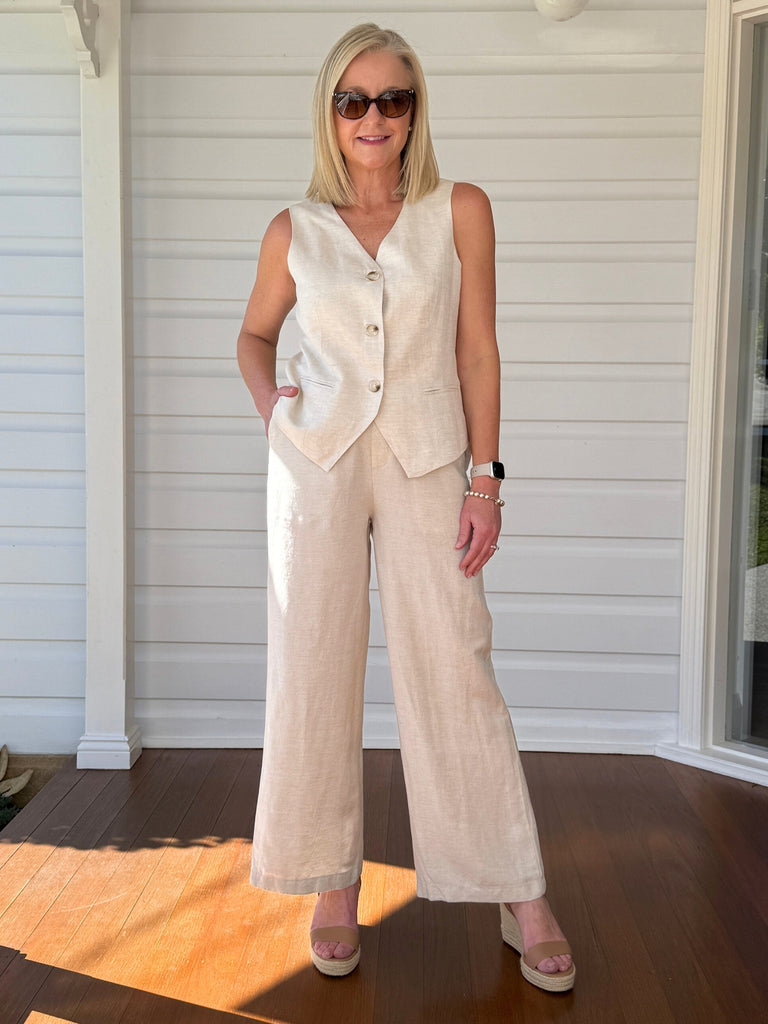 - This tailored vest is crafted from a soft linen blend, offering a polished yet relaxed look perfect for warm weather.