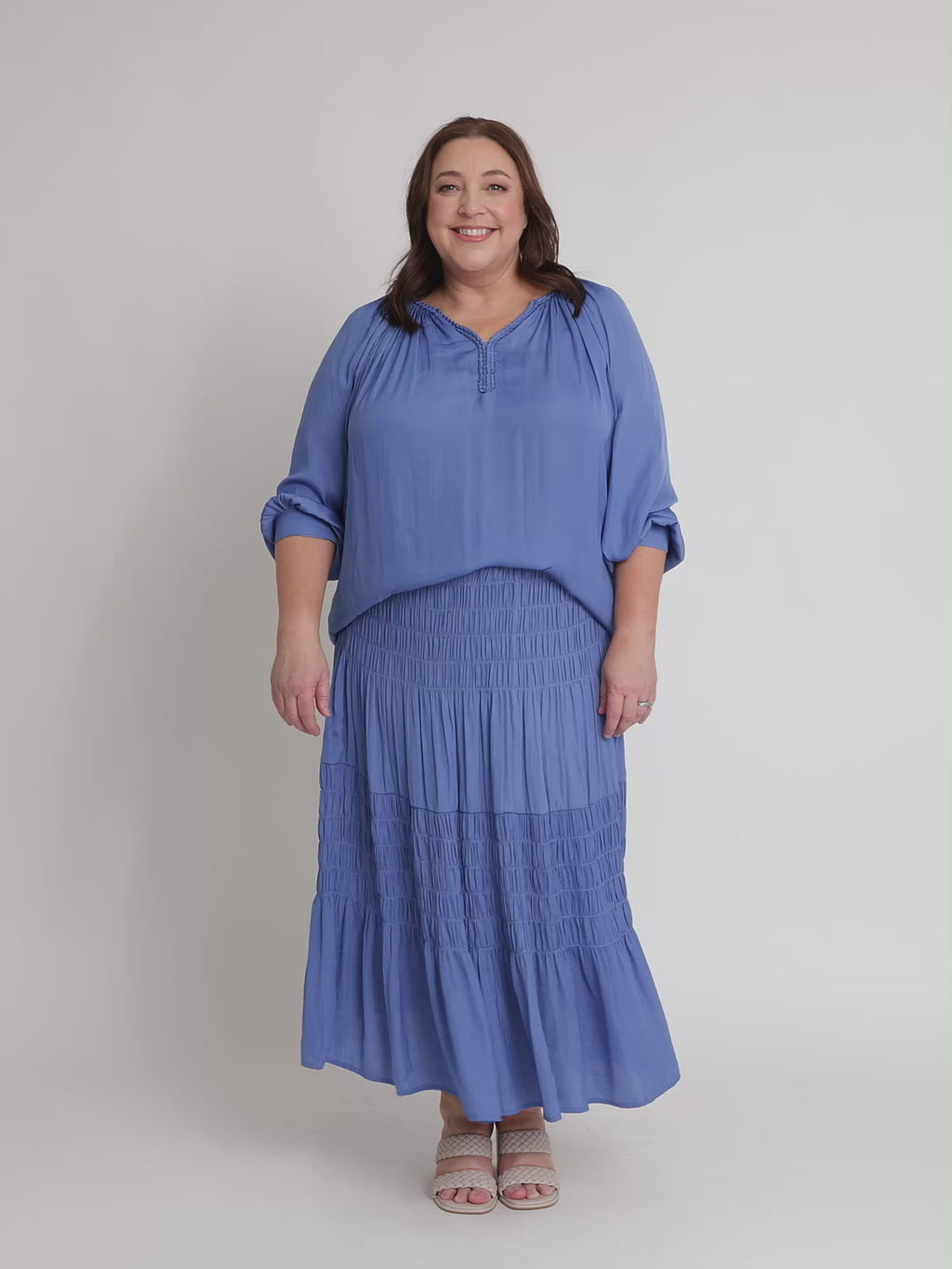 The Lux Ruche Skirt features all-over shirred elastic for a flattering, body-skimming fit with all-day comfort.