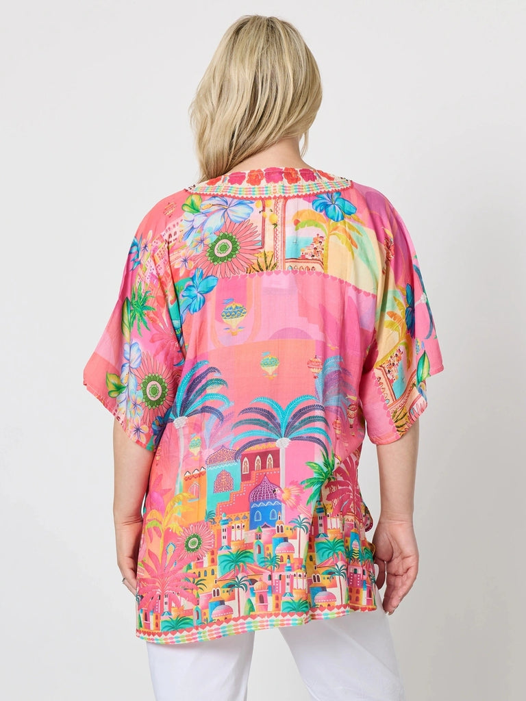 - Crafted from a soft, lightweight fabric, this vibrant piece showcases an intricate scenic print of lush green palms, bright pink and coral florals, and colourful domed buildings inspired by exotic destinations.