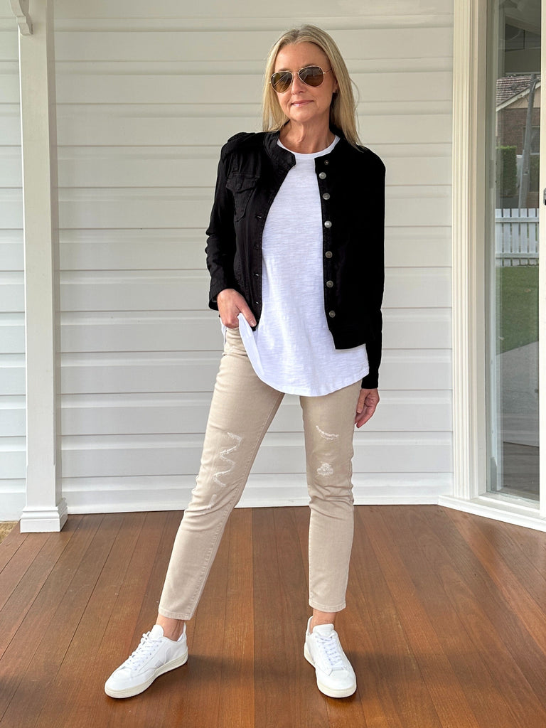 - Extra stretch for & lightweight denim for easy layering