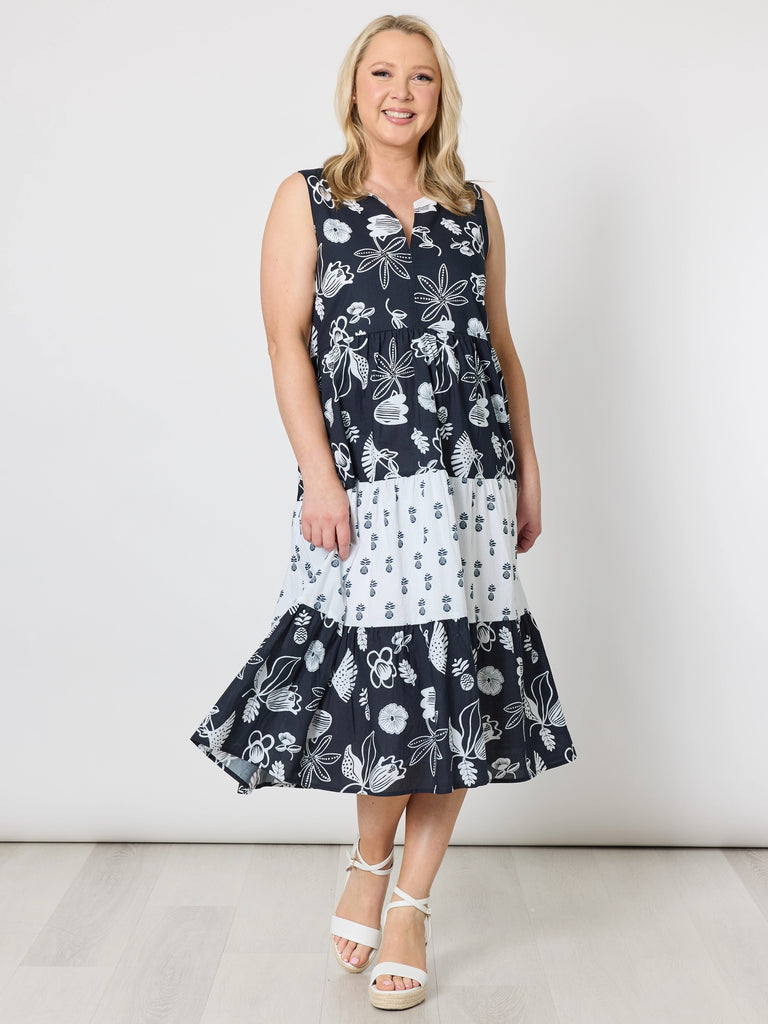 - Crafted from breathable cotton, this sleeveless midi dress showcases a striking navy and white tropical floral print, contrasted with a lighter panel through the skirt.