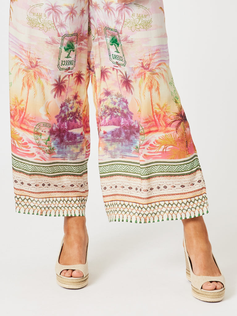 - Made from a lightweight fabric, these wide-leg pants feature a scenic postcard-inspired print in sunset hues, complete with playful passport stamp motifs.