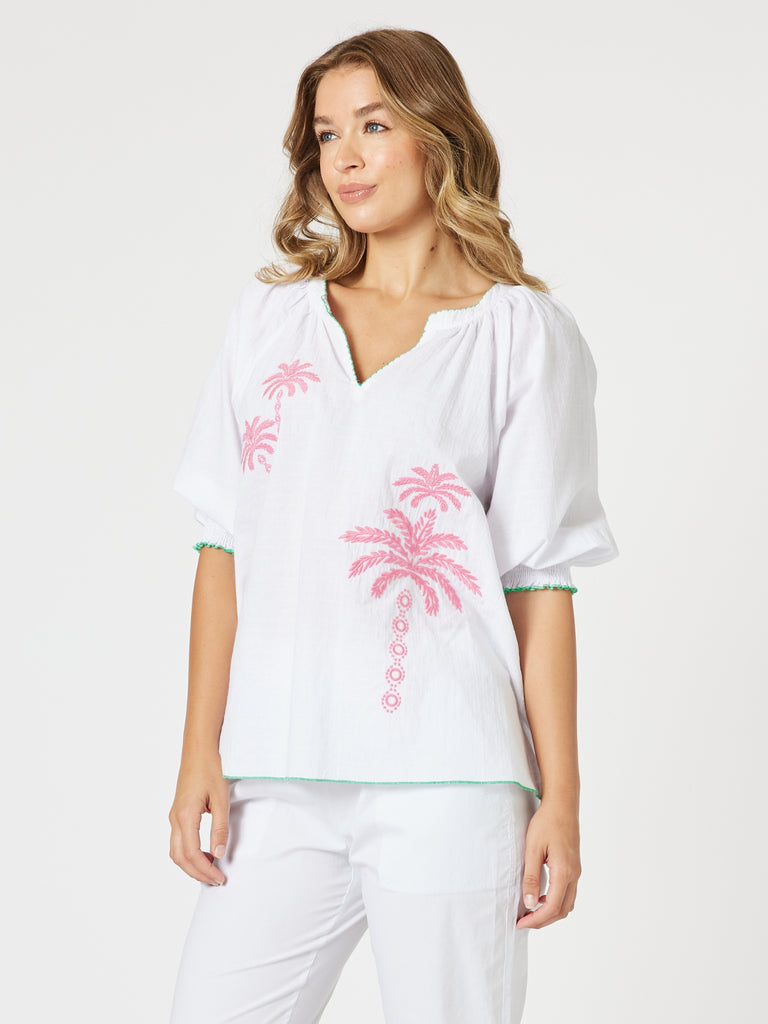 - Crafted from softly textured lightweight 100% cotton, this crisp white top features pink embroidered palm motifs on the front for a playful pop of colour.