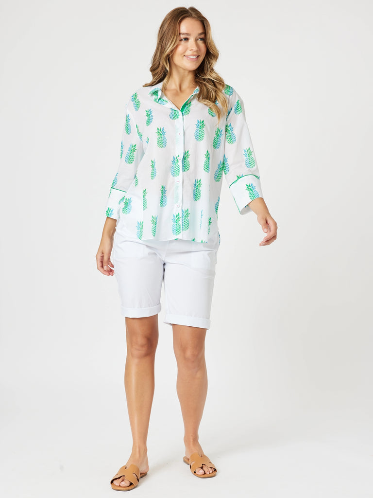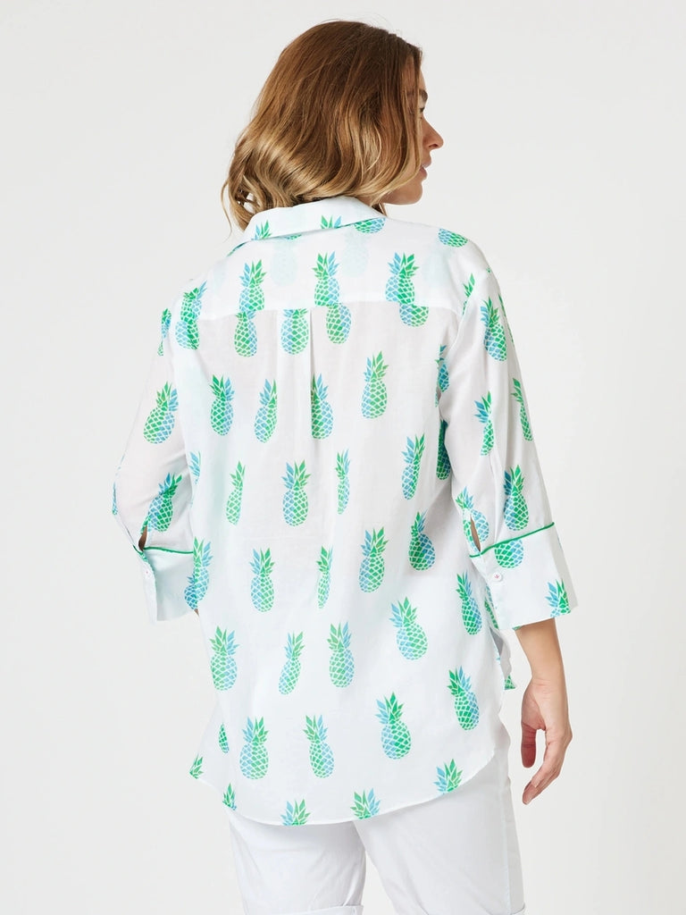- Featuring an all-over green pineapple print, this playful piece has a classic button-down front, 3/4 length sleeves finished with contrast green piping, and a gently curved hem for a flattering finish.
