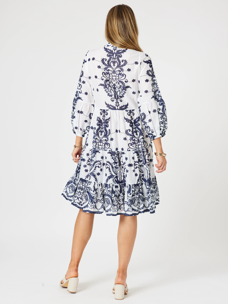 - Crafted from a lightweight, breathable 100% cotton, this stunning dress features a crisp white base adorned with intricate navy print for a timeless, nautical-inspired look.