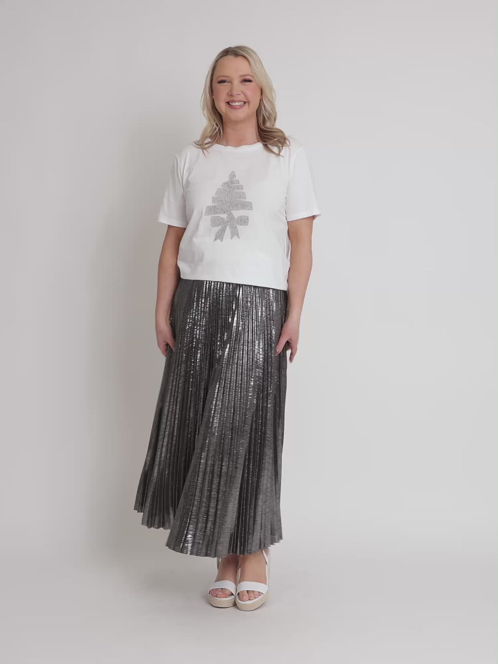 - Designed in a striking metallic silver, this fully lined skirt features an elegant pleated design that catches the light beautifully with every movement.