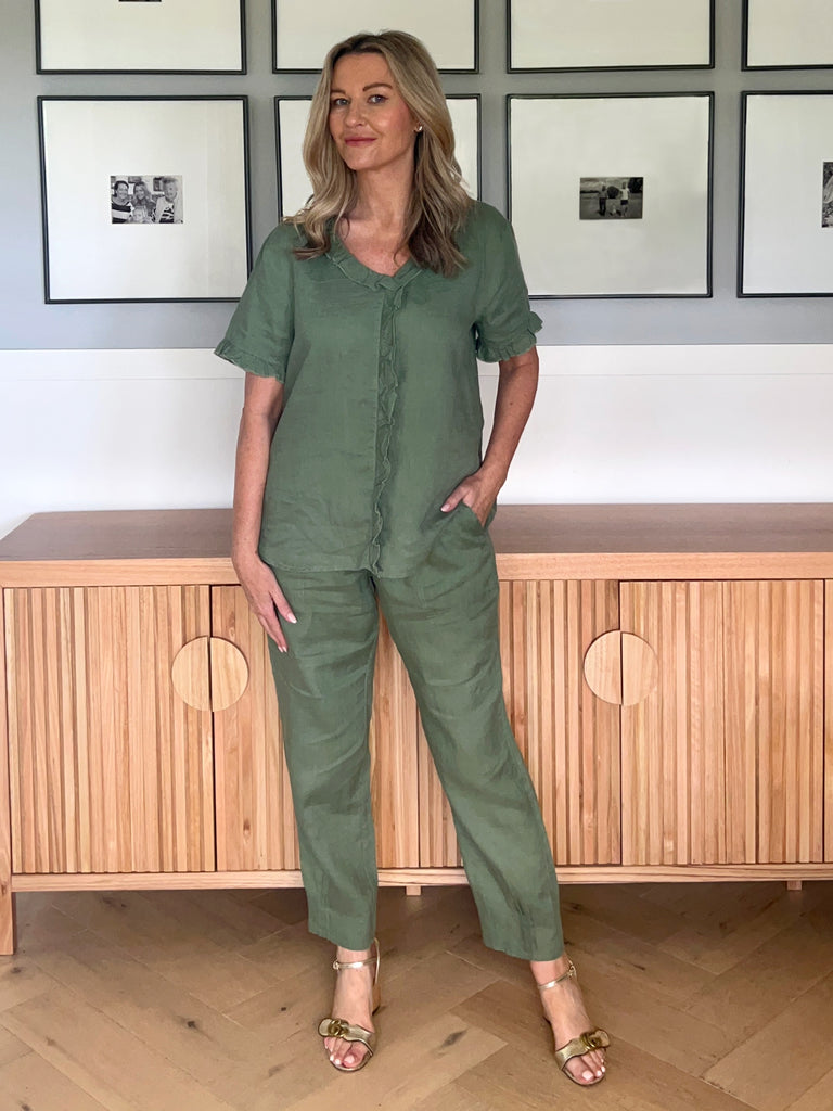 Tiffany Ruffle Linen Top - Khaki