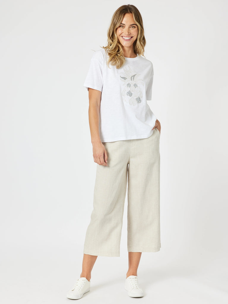 - This t-shirt features a standout pineapple motif detailed with shimmering sequins and metallic embroidery - a playful blend of texture and sparkle.